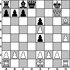 game notation in PGN-format [Event "April 2018"] [Site "www.myChess.de"] [Date "2018.04.11"] [Round "1"] [White "Joschi"] [Black "lotchi"] [ECO "B00"] [WhitemyELO "1528"] [BlackmyELO "1085"] [Result "1-0"] [TimeControl "10/1728000"] [WhiteDays "40"] [BlackDays "34"] [MyChessNo "111948"] 1. e4 Nc6 2. d4 d5 3. e5 e6 4. Nf3 h6 5. Be3 Bb4+ 6. Nbd2 Bxd2+ 7. Qxd2 g5 8. h3 f6 9. exf6 Nxf6 10. Bd3 O-O 11. h4 g4 12. Ne5 Ne4 13. Bxe4 Nxe5 14. dxe5 dxe4 15. Bxh6 Re8 16. Qf4 Re7 17. Qxg4+ Rg7 18. Qxg7# 1-0 position notation in FEN-format r1bq2k1/ppp3Q1/4p2B/4P3/4p2P/8/PPP1PPP1/R3K2R - KQ - 0 18 Captured white pieces: Captured black pieces: Click on a captured piece in order to display the desired move!