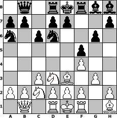 game notation in PGN-format [Event "MLN 960er langsam 2014"] [Site "www.myChess.de"] [Date "2014.01.31"] [Round "1"] [White "mattse"] [Black "SibylleSchwerdt"] [Variant "Fischerrandom"] [SetUp "1"] [FEN "nqnrkrbb/pppppppp/8/8/8/8/PPPPPPPP/NQNRKRBB w KQkq - 0 1"] [WhitemyELO "1819"] [BlackmyELO "1569"] [Result "0-1"] [TimeControl "10/3456000"] [WhiteDays "00"] [BlackDays "35"] [MyChessNo "92644"] 1. f4 g6 2. g3 f5 3. c3 Nd6 4. Nc2 c6 5. Nd3 Nc7 6. Be3 Na6 0-1 position notation in FEN-format 1q1rkrbb/pp1pp2p/n1pn2p1/5p2/5P2/2PNB1P1/PPNPPP1P/1Q1RKR1B - KQkq - 4 7 Captured white pieces: Captured black pieces: Click on a captured piece in order to display the desired move!