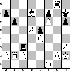 game notation in PGN-format [Event "8. Wikinger-Klubmeisterschaft"] [Site "www.myChess.de"] [Date "2012.08.01"] [Round "1"] [White "bane"] [Black "Grubengeist"] [ECO "A16"] [WhitemyELO "1945"] [BlackmyELO "1964"] [Result "0-1"] [TimeControl "10/1728000"] [WhiteDays "01"] [BlackDays "17"] [MyChessNo "83075"] 1. c4 Nf6 2. Nc3 e5 3. e4 Bc5 4. Be2 d6 5. Nf3 Nc6 6. O-O O-O 7. d3 h6 8. Bxh6 gxh6 9. Na4 Bd4 10. Qd2 Kh7 11. Nxd4 Nxd4 12. f4 Nxe2+ 13. Qxe2 Bg4 14. Qe3 Rg8 15. f5 Qe7 16. Nc3 Rg7 17. b4 Rag8 18. Rf2 c6 19. Raf1 d5 20. exd5 cxd5 21. Nxd5 Nxd5 22. cxd5 Qxb4 23. f6 Rg5 24. h3 Bd7 25. Kh2 Rg3 26. Qe4+ Qxe4 27. dxe4 Rc3 28. Rb2 b6 0-1 position notation in FEN-format 6r1/p2b1p1k/1p3P1p/3Pp3/4P3/2r4P/PRP3PK/5R2 - - - 0 29 Captured white pieces: Captured black pieces: Click on a captured piece in order to display the desired move!