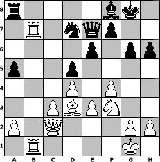 game notation in PGN-format [Event "Stonewall"] [Site "www.myChess.de"] [Date "2017.03.26"] [Round "1"] [White "sprinterde"] [Black "Knight"] [ECO "D00"] [WhitemyELO "1726"] [BlackmyELO "1187"] [Result "1-0"] [TimeControl "10/2592000"] [WhiteDays "90"] [BlackDays "90"] [MyChessNo "107591"] 1. d4 d5 2. e3 Nf6 3. Bd3 c5 4. c3 Nc6 5. f4 e6 6. Qc2 c4 7. Be2 g6 8. Nd2 Bg7 9. Ngf3 O-O 10. b3 b5 11. Ba3 Re8 12. bxc4 a6 13. c5 Bd7 14. O-O Rb8 15. Rfb1 h6 16. Bd3 Ne7 17. Ne5 a5 18. c6 Bxc6 19. Bxe7 Rxe7 20. Nxc6 Qc7 21. Nxe7+ Qxe7 22. Rxb5 Ra8 23. Rab1 Nd7 24. Rb7 Bf8 25. Nf3 1-0 position notation in FEN-format r4bk1/1R1nqp2/4p1pp/p2p4/3P1P2/2PBPN2/P1Q3PP/1R4K1 - - - 6 25 Captured white pieces: Captured black pieces: Click on a captured piece in order to display the desired move!