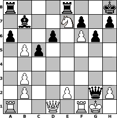 game notation in PGN-format [Event "Oktoberrevolution"] [Site "www.myChess.de"] [Date "2004.09.26"] [Round "2"] [White "Knight"] [Black "Kaiservd"] [ECO "B30"] [WhitemyELO "1374"] [BlackmyELO "1468"] [Result "0-1"] [TimeControl "10/864000"] [WhiteDays "07"] [BlackDays "10"] [MyChessNo "7086"] 1. e4 c5 2. Nf3 Nc6 3. Nc3 d6 4. Bb5 Bd7 5. O-O a6 6. Bc4 Nf6 7. Ng5 e6 8. d3 Nd4 9. f4 b5 10. Bb3 Be7 11. f5 Nxb3 12. axb3 exf5 13. exf5 O-O 14. d4 Bc6 15. d5 Bb7 16. Be3 Nxd5 17. Nxd5 Bxg5 18. Bxg5 Qxg5 19. c4 Rfe8 20. f6 g6 21. Ne7+ Kh8 22. cxb5 Qxg2# 0-1 position notation in FEN-format r3r2k/1b2Np1p/p2p1Pp1/1Pp5/8/1P6/1P2P1qP/R2Q1RK1 - - - 0 23 Captured white pieces: Captured black pieces: Click on a captured piece in order to display the desired move!