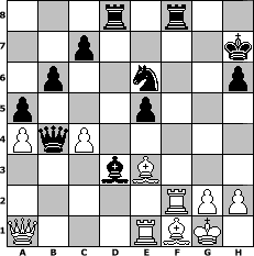 game notation in PGN-format [Event "CQS Sommer Open 2011"] [Site "www.myChess.de"] [Date "2011.08.01"] [Round "1"] [Board "1"] [White "bane"] [Black "jeremyt"] [ECO "A16"] [WhitemyELO "1932"] [BlackmyELO "2037"] [Result "1/2-1/2"] [TimeControl "10/3456000"] [WhiteDays "40"] [BlackDays "40"] [MyChessNo "75385"] 1. c4 Nf6 2. Nc3 e5 3. Nf3 Nc6 4. e4 Bb4 5. d3 d6 6. Be2 h6 7. O-O O-O 8. Be3 a5 9. a3 Bxc3 10. bxc3 Ng4 11. Bd2 f5 12. exf5 Bxf5 13. a4 Rb8 14. Ne1 Qd7 15. Nc2 Qe6 16. f3 Nf6 17. Ne3 Bg6 18. Qc2 Rbe8 19. Rae1 d5 20. Qb3 d4 21. Nd5 dxc3 22. Bxc3 Nd4 23. Nxf6+ gxf6 24. Qb2 Qd6 25. Rf2 b6 26. Bf1 Ne6 27. Bd2 Kh7 28. Be3 Qb4 29. Qa1 Rd8 30. f4 Bxd3 31. fxe5 fxe5 1/2-1/2 position notation in FEN-format 3r1r2/2p4k/1p2n2p/p3p3/PqP5/3bB3/5RPP/Q3RBK1 - - - 0 32 Captured white pieces: Captured black pieces: Click on a captured piece in order to display the desired move!
