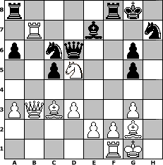 game notation in PGN-format [Event "Dabei ist alles 3"] [Site "www.myChess.de"] [Date "2008.05.14"] [Round "1"] [White "rakl"] [Black "Naunhofer"] [ECO "A04"] [WhitemyELO "1656"] [BlackmyELO "1690"] [Result "1-0"] [TimeControl "10/864000"] [WhiteDays "10"] [BlackDays "10"] [MyChessNo "44858"] 1. Nf3 c5 2. g3 b6 3. Bg2 Bb7 4. O-O Nf6 5. c4 e6 6. Nc3 Qc7 7. d3 Be7 8. Bf4 d6 9. a3 O-O 10. Nb5 Qd7 11. b4 a6 12. Nc3 h6 13. Rb1 g5 14. Bd2 d5 15. bxc5 bxc5 16. h4 Nh7 17. hxg5 hxg5 18. Ne5 Qc7 19. cxd5 exd5 20. Ng6 fxg6 21. Rxb7 Qe5 22. Nxd5 Nc6 23. Bc3 Qd6 24. Qb3 1-0 position notation in FEN-format r4rk1/1R2b2n/p1nq2p1/2pN2p1/8/PQBP2P1/4PPB1/5RK1 - - - 4 24 Captured white pieces: Captured black pieces: Click on a captured piece in order to display the desired move!