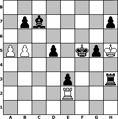 game notation in PGN-format [Event "Wrixum - Open die X"] [Site "www.myChess.de"] [Date "2012.10.06"] [Round "1"] [White "Schefsche"] [Black "Tomino"] [ECO "B12"] [WhitemyELO "1298"] [BlackmyELO "1718"] [Result "0-1"] [TimeControl "10/2592000"] [WhiteDays "130"] [BlackDays "123"] [MyChessNo "84254"] 1. e4 c6 2. d4 d5 3. e5 c5 4. Bb5+ Bd7 5. Bxd7+ Nxd7 6. Nf3 e6 7. O-O cxd4 8. Qxd4 Ne7 9. Bg5 Qc7 10. Bxe7 Bxe7 11. c3 O-O 12. a3 Bc5 13. Qf4 a5 14. b4 axb4 15. cxb4 Be7 16. a4 Qb6 17. b5 f6 18. Qh4 Rae8 19. Qd4 Bc5 20. Qb2 Nxe5 21. Nbd2 Nd3 22. Nc4 Nxb2 23. Nxb6 Bxb6 24. Rfb1 Nc4 25. Ra2 Rc8 26. h3 Rc7 27. Rc1 Rfc8 28. Nd2 Nxd2 29. Rxc7 Rxc7 30. Rxd2 Rc4 31. Ra2 Ba5 32. Kf1 Kf7 33. Ke2 e5 34. f3 f5 35. Kd3 Ke6 36. g3 e4+ 37. fxe4 fxe4+ 38. Ke3 Rc3+ 39. Kf4 Bc7+ 40. Kg4 Rxg3+ 41. Kh4 e3 42. Re2 Kf5 43. a5 g5+ 44. Kh5 Rxh3# 0-1 position notation in FEN-format 8/1pb4p/8/PP1p1kpK/8/4p2r/4R3/8 - - - 0 45 Captured white pieces: Captured black pieces: Click on a captured piece in order to display the desired move!