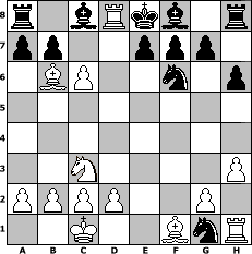 game notation in PGN-format [Event "FREUNDESTUNIER"] [Site "www.myChess.de"] [Date "2005.10.28"] [Round "1"] [White "Knight"] [Black "Biber"] [ECO "D00"] [WhitemyELO "1280"] [BlackmyELO "1211"] [Result "1-0"] [TimeControl "10/864000"] [WhiteDays "20"] [BlackDays "19"] [MyChessNo "18954"] 1. d4 d5 2. e4 dxe4 3. Nc3 Nf6 4. f3 exf3 5. Qxf3 c6 6. Be3 Qb6 7. h3 Nbd7 8. O-O-O h6 9. d5 Ne5 10. Bxb6 Nxf3 11. dxc6 Nxg1 12. Rd8# 1-0 position notation in FEN-format r1bRkb1r/pp2ppp1/1BP2n1p/8/8/2N4P/PPPP2P1/2K2BnR - kq - 1 12 Captured white pieces: Captured black pieces: Click on a captured piece in order to display the desired move!