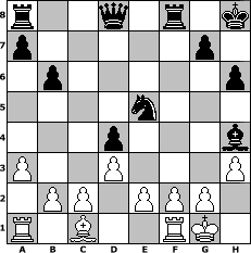 game notation in PGN-format [Event "F"] [Site "www.myChess.de"] [Date "2017.08.16"] [Round "1"] [White "wolni55"] [Black "martinus"] [ECO "B23"] [WhitemyELO "1387"] [BlackmyELO "1754"] [Result "0-1"] [TimeControl "10/2592000"] [WhiteDays "86"] [BlackDays "60"] [MyChessNo "109178"] 1. e4 c5 2. Nc3 Nc6 3. Bc4 e6 4. d3 Nf6 5. Nf3 h6 6. a3 d5 7. exd5 exd5 8. Ba2 Bg4 9. h3 Bxf3 10. Qxf3 d4 11. Ne4 Be7 12. O-O O-O 13. Nxf6+ Bxf6 14. Qg3 Bh4 15. Qg6 Kh8 16. Bxf7 Ne5 17. Qh5 Nxf7 18. Qxc5 b6 19. Qe5 Nxe5 0-1 position notation in FEN-format r2q1r1k/p5p1/1p5p/4n3/3p3b/P2P3P/1PP1PPP1/R1B2RK1 - - - 0 20 Captured white pieces: Captured black pieces: Click on a captured piece in order to display the desired move!