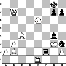 game notation in PGN-format [Event "Aljechin zum Fr"] [Site "www.myChess.de"] [Date "2005.10.21"] [Round "1"] [White "tuergeist"] [Black "Knight"] [ECO "B03"] [WhitemyELO "1196"] [BlackmyELO "1259"] [Result "1-0"] [TimeControl "10/864000"] [WhiteDays "08"] [BlackDays "10"] [MyChessNo "18718"] 1. e4 Nf6 2. e5 Nd5 3. d4 d6 4. c4 Nb6 5. f4 dxe5 6. fxe5 Bf5 7. Nc3 e6 8. Nf3 Be7 9. Be2 O-O 10. O-O f6 11. Nh4 fxe5 12. dxe5 Qxd1 13. Rxd1 Nc6 14. g3 Nxe5 15. b3 Bxh4 16. gxh4 Bh3 17. Ba3 Rf4 18. c5 Raf8 19. cxb6 Rc8 20. bxa7 Rxh4 21. Bb2 Rf8 22. Nb5 Re4 23. Re1 Ng6 24. Nxc7 Nf4 25. Bc4 Rxe1+ 26. Rxe1 Rf6 27. a8=Q+ Rf8 28. Qxb7 Bg4 29. Nxe6 Nh3+ 30. Kg2 Rf2+ 31. Kg3 1-0 position notation in FEN-format 6k1/1Q4pp/4N3/8/2B3b1/1P4Kn/PB3r1P/4R3 - - - 4 31 Captured white pieces: Captured black pieces: Click on a captured piece in order to display the desired move!