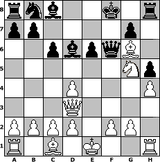 game notation in PGN-format [Event "Mailüfterl"] [Site "www.myChess.de"] [Date "2018.04.23"] [Round "1"] [White "Helmut48"] [Black "BobbyF4"] [ECO "A40"] [WhitemyELO "2010"] [BlackmyELO "1424"] [Result "1-0"] [TimeControl "10/1728000"] [WhiteDays "39"] [BlackDays "00"] [MyChessNo "112038"] 1. d4 e6 2. e4 d5 3. Nc3 Ne7 4. Nf3 Ng6 5. h4 dxe4 6. Nxe4 h5 7. Bd3 c6 8. Neg5 Bd6 9. Nxf7 Kxf7 10. Ng5+ Kf8 11. Bxg6 Qf6 12. Qd3 1-0 position notation in FEN-format rnb2k1r/pp4p1/2pbpqB1/6Np/3P3P/3Q4/PPPP1PP1/R1B1K2R - KQ - 2 12 Captured white pieces: Captured black pieces: Click on a captured piece in order to display the desired move!