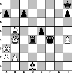 game notation in PGN-format [Event "Winterm"] [Site "www.myChess.de"] [Date "2006.11.29"] [Round "1"] [White "bane"] [Black "Meta"] [ECO "A20"] [WhitemyELO "1814"] [BlackmyELO "1836"] [Result "0-1"] [TimeControl "10/864000"] [WhiteDays "09"] [BlackDays "10"] [MyChessNo "30525"] 1. c4 e5 2. e4 Nc6 3. Nc3 Bc5 4. d3 d6 5. Nf3 f5 6. Bg5 Nf6 7. Nd5 O-O 8. Nxf6+ gxf6 9. Bh6 Re8 10. Be2 Kh8 11. Qc2 f4 12. O-O-O Bxf2 13. Kb1 Rg8 14. Bf1 Be3 15. Re1 Bb6 16. g3 Qe8 17. Be2 Qg6 18. Bxf4 exf4 19. gxf4 Qh6 20. f5 Rg2 21. Qd1 Bd7 22. Bf1 Rf2 23. Be2 Nd4 24. Nxd4 Bxd4 25. Rhg1 b5 26. c5 dxc5 27. h4 c4 28. Rg3 Bc6 29. Rf3 cxd3 30. Rxf2 Bxf2 31. Bxd3 Bxe1 32. Qxe1 Rd8 33. Kc2 Qf4 34. Qc3 Rd6 35. e5 fxe5 36. Qe1 Bf3 37. Bxb5 Qxf5+ 38. Kb3 Bd1+ 39. Ka3 Qf4 40. Qb4 Rd4 0-1 position notation in FEN-format 7k/p1p4p/8/1B2p3/1Q1r1q1P/K7/PP6/3b4 - - - 6 41 Captured white pieces: Captured black pieces: Click on a captured piece in order to display the desired move!