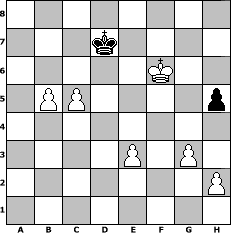 game notation in PGN-format [Event "Wer schnell zieht,ist schneller fertig!"] [Site "www.myChess.de"] [Date "2015.10.08"] [Round "1"] [White "FrankB"] [Black "Achimkogge"] [ECO "D02"] [WhitemyELO "1649"] [BlackmyELO "1490"] [Result "1-0"] [TimeControl "10/1728000"] [WhiteDays "17"] [BlackDays "15"] [MyChessNo "100734"] 1. d4 d5 2. Nf3 Nc6 3. e3 Bg4 4. Be2 e6 5. O-O Bd6 6. c4 dxc4 7. Bxc4 Nb4 8. Nbd2 c6 9. a3 Na6 10. Bxa6 bxa6 11. Qa4 Ne7 12. Qxa6 Qc7 13. b4 O-O 14. Bb2 Bxf3 15. Nxf3 Nd5 16. Rac1 Nb6 17. Rc2 Rfc8 18. Rfc1 Qd7 19. Nd2 Rc7 20. Nb3 Rac8 21. Na5 h6 22. Qe2 Nd5 23. g3 f5 24. Nc4 Nf6 25. f3 Be7 26. Ne5 Qd6 27. Qa6 c5 28. Qxd6 Bxd6 29. dxc5 Bxe5 30. Bxe5 Rd7 31. Kf2 a6 32. Ke2 Rc6 33. Bxf6 gxf6 34. Rd2 Rxd2+ 35. Kxd2 Kf7 36. Kc3 Rc8 37. Rd1 Ke7 38. Kc4 h5 39. a4 e5 40. b5 axb5+ 41. axb5 Rd8 42. Rxd8 Kxd8 43. Kd5 e4 44. fxe4 fxe4 45. Kxe4 Kc7 46. Kf5 Kd7 47. Kxf6 1-0 position notation in FEN-format 8/3k4/5K2/1PP4p/8/4P1P1/7P/8 - - - 0 47 Captured white pieces: Captured black pieces: Click on a captured piece in order to display the desired move!