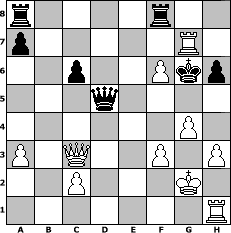 game notation in PGN-format [Event "Vor dem Urlaub noch ein schnelles Turnier!"] [Site "www.myChess.de"] [Date "2012.06.16"] [Round "1"] [White "lotchi"] [Black "reisender"] [ECO "C46"] [WhitemyELO "1192"] [BlackmyELO "1346"] [Result "1-0"] [TimeControl "10/864000"] [WhiteDays "10"] [BlackDays "10"] [MyChessNo "82273"] 1. e4 e5 2. Nf3 Nc6 3. Nc3 Bb4 4. a3 Bxc3 5. dxc3 Nf6 6. Bd3 O-O 7. b4 d6 8. Bg5 h6 9. Bxf6 Qxf6 10. b5 Ne7 11. c4 Bg4 12. Be2 c6 13. bxc6 bxc6 14. h3 Bh5 15. g4 Bg6 16. Qd3 d5 17. cxd5 Nxd5 18. Qc4 Nf4 19. Kf1 Nxe2 20. Qxe2 Qf4 21. Re1 f5 22. exf5 Bf7 23. Nxe5 Rfe8 24. Qe3 Qa4 25. Qc3 Bd5 26. f3 Qb5+ 27. Kg2 Re7 28. Ng6 Ree8 29. f6 Rf8 30. Ne7+ Kf7 31. Nxd5 Qxd5 32. Re7+ Kg6 33. Rxg7# 1-0 position notation in FEN-format r4r2/p5R1/2p2Pkp/3q4/6P1/P1Q2P1P/2P3K1/7R - - - 0 33 Captured white pieces: Captured black pieces: Click on a captured piece in order to display the desired move!