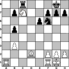 game notation in PGN-format [Event "Dezember-Turnier"] [Site "www.myChess.de"] [Date "2009.12.01"] [Round "1"] [White "zidan"] [Black "Steppenwolf"] [ECO "B10"] [WhitemyELO "1473"] [BlackmyELO "1279"] [Result "1-0"] [TimeControl "10/2592000"] [WhiteDays "80"] [BlackDays "78"] [MyChessNo "61095"] 1. e4 c6 2. Nf3 d5 3. exd5 cxd5 4. d4 Nf6 5. c4 Nc6 6. Bf4 Bg4 7. Nc3 Nxd4 8. Qxd4 dxc4 9. Be2 Qxd4 10. Nxd4 Bxe2 11. Ndxe2 e6 12. Nb5 Bb4+ 13. Nec3 O-O 14. Bd6 Rfd8 15. Bxb4 Rd7 16. O-O Rd2 17. b3 cxb3 18. axb3 a6 19. Nc7 Rc8 20. N3b5 axb5 21. Bxd2 1-0 position notation in FEN-format 2r3k1/1pN2ppp/4pn2/1p6/8/1P6/3B1PPP/R4RK1 - - - 0 21 Captured white pieces: Captured black pieces: Click on a captured piece in order to display the desired move!
