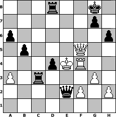 game notation in PGN-format [Event "Zug um Zug gegen Fr"] [Site "www.myChess.de"] [Date "2012.03.12"] [Round "1"] [White "Joschi"] [Black "espero"] [ECO "C17"] [WhitemyELO "1621"] [BlackmyELO "1616"] [Result "0-1"] [TimeControl "10/2592000"] [WhiteDays "145"] [BlackDays "142"] [MyChessNo "80560"] 1. e4 e6 2. d4 d5 3. Nc3 Bb4 4. e5 c5 5. a3 Ba5 6. Bb5+ Bd7 7. Bxd7+ Qxd7 8. Nf3 cxd4 9. Qxd4 Ne7 10. O-O Nbc6 11. Qd3 Ng6 12. Re1 Bc7 13. Nb5 Bxe5 14. Nxe5 Ncxe5 15. Qb3 O-O 16. Bg5 h6 17. Be3 a6 18. Nd4 Nc4 19. Nf3 Nxe3 20. Rxe3 Rac8 21. c3 Rc4 22. Ne5 Nxe5 23. Rxe5 b5 24. Rd1 Qc7 25. Rh5 Re4 26. g3 Qc4 27. Qc2 Re2 28. Rd2 Re1+ 29. Kg2 Qf1+ 30. Kf3 f5 31. Re2 Qh1+ 32. Ke3 d4+ 33. cxd4 Rc1 34. Qd3 Rd8 35. Rh4 Rc4 36. Rd2 Rc1 37. Re2 e5 38. Qxf5 exd4+ 39. Kd3 Rc6 40. Rf4 Qb1+ 41. Kd2 Qxb2+ 42. Kd3 Rc3+ 43. Ke4 Qxe2# 0-1 position notation in FEN-format 3r2k1/6p1/p6p/1p3Q2/3pKR2/P1r3P1/4qP1P/8 - - - 0 44 Captured white pieces: Captured black pieces: Click on a captured piece in order to display the desired move!