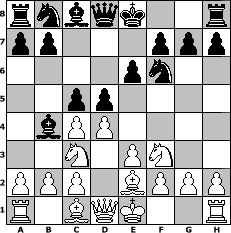game notation in PGN-format [Event "Winter 2011/12"] [Site "www.myChess.de"] [Date "2011.12.22"] [Round "1"] [White "lasker"] [Black "Baehr008"] [ECO "A13"] [WhitemyELO "1286"] [BlackmyELO "1989"] [Result "1-0"] [TimeControl "10/2592000"] [WhiteDays "21"] [BlackDays "00"] [MyChessNo "78337"] 1. c4 e6 2. Nc3 Nf6 3. d4 Bb4 4. Nf3 c5 5. e3 d5 6. Be2 1-0 position notation in FEN-format rnbqk2r/pp3ppp/4pn2/2pp4/1bPP4/2N1PN2/PPP1BPPP/R1BQK2R - KQkq - 1 6 Captured white pieces: Captured black pieces: Click on a captured piece in order to display the desired move!