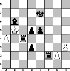game notation in PGN-format [Event "erste MNS offene ClubmeisterschaftGruppe B"] [Site "www.myChess.de"] [Date "2013.03.29"] [Round "1"] [White "borsti"] [Black "Teresa"] [ECO "C41"] [WhitemyELO "1232"] [BlackmyELO "1557"] [Result "0-1"] [TimeControl "10/2592000"] [WhiteDays "30"] [BlackDays "25"] [MyChessNo "87548"] 1. e4 e5 2. Nf3 d6 3. h3 c5 4. c4 f5 5. d3 Nc6 6. Bd2 Nf6 7. Bg5 fxe4 8. dxe4 Nd4 9. Nxd4 cxd4 10. Bd3 h6 11. Bxf6 gxf6 12. Nd2 h5 13. Nf3 Qa5+ 14. Qd2 Qxd2+ 15. Kxd2 h4 16. b3 a5 17. a4 b6 18. Be2 Ke7 19. Rac1 Bh6+ 20. Kd3 f5 21. Nxh4 fxe4+ 22. Kxe4 Bxc1 23. Nf5+ Bxf5+ 24. Kxf5 Rhf8+ 25. Ke4 Rxf2 26. Bf3 Be3 27. Rb1 Rf8 28. b4 axb4 29. Rxb4 Rf4+ 30. Kd5 d3 31. Rxb6 Bxb6 32. Be4 Rxe4 33. Kc6 Rxc4+ 34. Kb5 d5 0-1 position notation in FEN-format 8/4k3/1b6/1K1pp3/P1r5/3p3P/5rP1/8 - - - 0 35 Captured white pieces: ![]() ![]() ![]() ![]() ![]() ![]() ![]() ![]() ![]() ![]() ![]() ![]() ![]() ![]() ![]() Captured black pieces: ![]() ![]() ![]() ![]() ![]() ![]() ![]() ![]() ![]() ![]() ![]() ![]() ![]() ![]() ![]() Click on a captured piece in order to display the desired move!