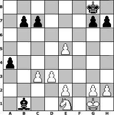 game notation in PGN-format [Event "Pfingst -Turnier"] [Site "www.myChess.de"] [Date "2009.05.30"] [Round "1"] [White "Steppenwolf"] [Black "Master1"] [ECO "C60"] [WhitemyELO "1217"] [BlackmyELO "1304"] [Result "0-1"] [TimeControl "10/2592000"] [WhiteDays "71"] [BlackDays "86"] [MyChessNo "56165"] 1. e4 e5 2. Nf3 Nc6 3. Bb5 Qf6 4. Nc3 Bb4 5. d3 Bxc3+ 6. bxc3 Nge7 7. Ba3 d6 8. d4 Bd7 9. O-O a6 10. Bxc6 Bxc6 11. dxe5 dxe5 12. Qd3 Rd8 13. Qc4 O-O 14. Rad1 Rxd1 15. Rxd1 Re8 16. Bxe7 Qxe7 17. a4 Rd8 18. Rxd8+ Qxd8 19. Qd3 Qxd3 20. cxd3 Bxa4 21. Nxe5 f6 22. Nf3 Bc2 23. Ne1 Bb1 24. f4 a5 25. e5 fxe5 26. fxe5 a4 0-1 position notation in FEN-format 6k1/1pp3pp/8/4P3/p7/2PP4/4P1PP/1b2N1K1 - - - 0 27 Captured white pieces: ![]() ![]() ![]() ![]() ![]() ![]() ![]() ![]() ![]() ![]() ![]() ![]() ![]() ![]() ![]() Captured black pieces: ![]() ![]() ![]() ![]() ![]() ![]() ![]() ![]() ![]() ![]() ![]() ![]() ![]() ![]() ![]() Click on a captured piece in order to display the desired move!