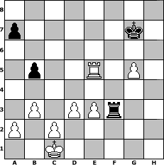 game notation in PGN-format [Event "101 Geburtstag von Miguel Najdorf"] [Site "www.myChess.de"] [Date "2011.04.15"] [Round "1"] [White "lotchi"] [Black "Haki"] [ECO "B23"] [WhitemyELO "1431"] [BlackmyELO "1243"] [Result "1-0"] [TimeControl "10/1728000"] [WhiteDays "60"] [BlackDays "60"] [MyChessNo "73338"] 1. e4 c5 2. Nc3 Nc6 3. Nf3 e5 4. Bb5 Nge7 5. d3 Ng6 6. Bg5 Be7 7. h4 Bxg5 8. hxg5 Nf4 9. Rh2 O-O 10. Bxc6 dxc6 11. Ne2 Nxe2 12. Qxe2 Qb6 13. b3 Bg4 14. O-O-O Qb4 15. Rdh1 f5 16. Rxh7 Kf7 17. exf5 Qf4+ 18. Qe3 Bxf3 19. gxf3 Qxe3+ 20. fxe3 b5 21. f6 Rg8 22. fxg7 Rxg7 23. Rxg7+ Kxg7 24. Rh6 Rh8 25. Rxc6 Rh3 26. Rxc5 Rxf3 27. Rxe5 1-0 position notation in FEN-format 8/p5k1/8/1p2R1P1/8/1P1PPr2/P1P5/2K5 - - - 0 27 Captured white pieces: Captured black pieces: Click on a captured piece in order to display the desired move!