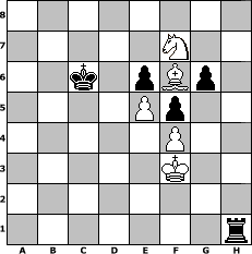 game notation in PGN-format [Event "Ohne techn. Hilfsmittel..."] [Site "www.myChess.de"] [Date "2013.02.13"] [Round "1"] [White "haggard"] [Black "Stoertebecker"] [ECO "A15"] [WhitemyELO "1977"] [BlackmyELO "1773"] [Result "1/2-1/2"] [TimeControl "10/864000"] [WhiteDays "78"] [BlackDays "75"] [MyChessNo "86512"] 1. c4 Nf6 2. g3 c6 3. Bg2 d5 4. Nf3 Bf5 5. cxd5 cxd5 6. Qb3 Qb6 7. Nc3 Qxb3 8. axb3 Nc6 9. d3 e6 10. O-O a6 11. Bf4 Be7 12. Ne5 Nxe5 13. Bxe5 Rd8 14. e4 dxe4 15. dxe4 Bg6 16. Rad1 O-O 17. Bc7 Rxd1 18. Rxd1 Rc8 19. Bd6 Bh5 20. Bxe7 Bxd1 21. Bxf6 Bxb3 22. Be7 b5 23. Bf1 Bc4 24. e5 Bxf1 25. Kxf1 Rc7 26. Bd6 Rc4 27. Ke1 f5 28. Kd2 Rd4+ 29. Ke3 Rc4 30. Kd3 g6 31. b3 Rc8 32. h4 Kf7 33. f3 Rc6 34. g4 Rc8 35. g5 Rc6 36. Kd2 Rc8 37. Ne2 Rh8 38. b4 Ra8 39. Nd4 a5 40. Nxb5 axb4 41. Bxb4 Ra4 42. Nd6+ Kg8 43. Kc3 Ra1 44. Kd3 Rh1 45. Bc5 Rxh4 46. Nb7 Rh1 47. Ke3 Re1+ 48. Kf4 Rc1 49. Kg3 Rc3 50. Kf2 Rc2+ 51. Ke3 Rc3+ 52. Ke2 Rc2+ 53. Kd3 Rc1 54. f4 Rb1 55. Nd6 Rb3+ 56. Kd2 Rf3 57. Be3 Rh3 58. Ke2 h5 59. gxh6 Rxh6 60. Bb6 Kg7 61. Bd8 Rh3 62. Bf6+ Kf8 63. Nb7 Ke8 64. Nc5 Kf7 65. Bg5 Rc3 66. Nb7 Ke8 67. Nd6+ Kd7 68. Bf6 Ra3 69. Nf7 Ra4 70. Kf3 Ra3+ 71. Kg2 Ra2+ 72. Kg3 Ra1 73. Nh8 Rh1 74. Kg2 Rh6 75. Nf7 Rh7 76. Ng5 Rh4 77. Kf3 Rh1 78. Nf7 Kc6 1/2-1/2 position notation in FEN-format 8/5N2/2k1pBp1/4Pp2/5P2/5K2/8/7r - - - 38 79 Captured white pieces: Captured black pieces: Click on a captured piece in order to display the desired move!
