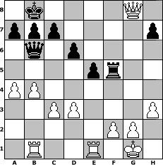 game notation in PGN-format [Event "Zug um Zug gegen Fr"] [Site "www.myChess.de"] [Date "2012.03.12"] [Round "1"] [White "Joschi"] [Black "Knight"] [ECO "C65"] [WhitemyELO "1621"] [BlackmyELO "1271"] [Result "1-0"] [TimeControl "10/2592000"] [WhiteDays "88"] [BlackDays "89"] [MyChessNo "80570"] 1. e4 e5 2. Nf3 Nc6 3. Bb5 Nf6 4. O-O Bc5 5. d3 d6 6. h3 Bd7 7. Re1 Nd4 8. Bxd7+ Qxd7 9. Bg5 Nxf3+ 10. Qxf3 O-O-O 11. Bxf6 gxf6 12. Qxf6 Rhg8 13. Qf3 Kb8 14. Nc3 Bd4 15. Rab1 Qc6 16. Ne2 Qb6 17. Nxd4 Qxd4 18. c3 Qb6 19. b4 Rd7 20. a4 f5 21. exf5 Rf7 22. Qd5 Rxf5 23. Qxg8+ 1-0 position notation in FEN-format 1k4Q1/ppp4p/1q1p4/4pr2/PP6/2PP3P/5PP1/1R2R1K1 - - - 0 23 Captured white pieces: Captured black pieces: Click on a captured piece in order to display the desired move!
