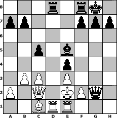 game notation in PGN-format [Event "1.Schaltjahresturnier@mySchach"] [Site "www.myChess.de"] [Date "2004.02.29"] [Round "1"] [White "NoBody"] [Black "Phantasos"] [ECO "A46"] [WhitemyELO "1833"] [BlackmyELO "1695"] [Result "0-1"] [TimeControl "10/1728000"] [WhiteDays "60"] [BlackDays "59"] [MyChessNo "2628"] 1. d4 Nf6 2. Nf3 d5 3. e3 e6 4. Bd3 c5 5. c3 Nc6 6. Nbd2 Bd6 7. O-O O-O 8. Re1 e5 9. dxe5 Nxe5 10. Nxe5 Bxe5 11. Nf3 Bc7 12. b3 Bg4 13. Be2 Ne4 14. Bd2 Bxf3 15. Bxf3 Bxh2+ 16. Kf1 Be5 17. Qc2 Qh4 18. Bxe4 dxe4 19. Rad1 Rad8 20. Bc1 Qh1+ 21. Ke2 Qxg2 0-1 position notation in FEN-format 3r1rk1/pp3ppp/8/2p1b3/4p3/1PP1P3/P1Q1KPq1/2BRR3 - - - 0 22 Captured white pieces: Captured black pieces: Click on a captured piece in order to display the desired move!