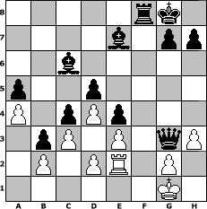 game notation in PGN-format [Event "CAISSA.COM IS DEAD TO ME!"] [Site "www.myChess.de"] [Date "2020.03.28"] [Round "2"] [White "borsti"] [Black "Seneca"] [ECO "D00"] [WhitemyELO "1244"] [BlackmyELO "1570"] [Result "0-1"] [TimeControl "10/2592000"] [WhiteDays "30"] [BlackDays "29"] [MyChessNo "117746"] 1. d4 d5 2. Bf4 Nf6 3. e3 e6 4. a3 Be7 5. Bd3 a6 6. Nf3 O-O 7. Nc3 c5 8. O-O c4 9. Be2 b5 10. a4 b4 11. Nb1 a5 12. Ne5 Bb7 13. c3 b3 14. Na3 Nbd7 15. Nb5 Nxe5 16. Bxe5 Bc6 17. Bc7 Qd7 18. f4 Bxb5 19. Be5 Bc6 20. Rf3 Ne4 21. f5 f6 22. fxe6 Qxe6 23. h3 fxe5 24. Rxf8+ Rxf8 25. Bf3 Nf6 26. Bg4 Nxg4 27. Qxg4 Qxg4 28. Re1 Qg3 29. Re2 e4 0-1 position notation in FEN-format 5rk1/4b1pp/2b5/p2p4/P1pPp3/1pP1P1qP/1P1PR1P1/6K1 - - - 0 30 Captured white pieces: Captured black pieces: Click on a captured piece in order to display the desired move!