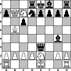 game notation in PGN-format [Event "Kampf um Mittelerde - War for Middle Earth"] [Site "www.myChess.de"] [Date "2012.03.11"] [Round "1"] [Board "3"] [White "Knight"] [Black "zidan"] [ECO "D00"] [WhitemyELO "1264"] [BlackmyELO "1294"] [Result "1-0"] [TimeControl "10/864000"] [WhiteDays "20"] [BlackDays "05"] [MyChessNo "80499"] 1. d4 d5 2. e4 dxe4 3. Nc3 Nf6 4. f3 exf3 5. Qxf3 Nc6 6. Be3 Nxd4 7. Bxd4 Qxd4 8. Bd3 Bg4 9. Qxb7 Qe3+ 10. Nge2 Rd8 11. Bb5+ Nd7 12. Nd5 c6 13. Nc7# 1-0 position notation in FEN-format 3rkb1r/pQNnpppp/2p5/1B6/6b1/4q3/PPPPN1PP/R3K2R - KQk - 1 13 Captured white pieces: Captured black pieces: Click on a captured piece in order to display the desired move!