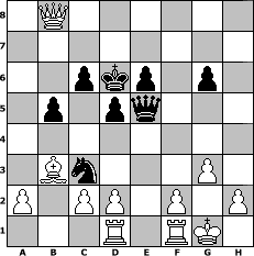 game notation in PGN-format [Event "Frohes Fest und spannende Spiele"] [Site "www.myChess.de"] [Date "2018.12.21"] [Round "1"] [White "freizeitspieler"] [Black "augustus"] [ECO "D00"] [WhitemyELO "1544"] [BlackmyELO "1072"] [Result "1-0"] [TimeControl "10/864000"] [WhiteDays "39"] [BlackDays "22"] [MyChessNo "113801"] 1. d4 d5 2. e4 e6 3. Nc3 f6 4. Bb5+ c6 5. Ba4 Bb4 6. Qf3 Ne7 7. e5 Qb6 8. exf6 Rf8 9. Qh5+ g6 10. Qxh7 Rxf6 11. Nf3 Kd7 12. Ne5+ Kd6 13. Be3 Nd7 14. Nf7+ Kc7 15. g3 Bxc3+ 16. bxc3 Qb2 17. O-O b5 18. Bb3 Bb7 19. Bf4+ Kb6 20. Bg5 Qxc3 21. Bxf6 Nxf6 22. Qg7 Qxd4 23. Nd6 Nc8 24. Qxb7+ Kc5 25. Nxc8 Rxc8 26. Qxc8 Ne4 27. Rad1 Qe5 28. Qa6 Nc3 29. Qxa7+ Kd6 30. Qb8+ 1-0 position notation in FEN-format 1Q6/8/2pkp1p1/1p1pq3/8/1Bn3P1/P1PP1P1P/3R1RK1 - - - 2 30 Captured white pieces: Captured black pieces: Click on a captured piece in order to display the desired move!