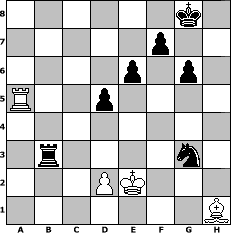game notation in PGN-format [Event "Mit Dame Gambit ins Fr"] [Site "www.myChess.de"] [Date "2006.01.31"] [Round "1"] [White "MichaelKnopf"] [Black "Andylein1989"] [ECO "D06"] [WhitemyELO "1500"] [BlackmyELO "1368"] [Result "0-1"] [TimeControl "10/864000"] [WhiteDays "10"] [BlackDays "10"] [MyChessNo "22090"] 1. d4 d5 2. c4 Nf6 3. c5 Bf5 4. g3 Nc6 5. Bg2 Nb4 6. Na3 e6 7. h3 h5 8. Nf3 Be4 9. O-O b6 10. Qa4+ Qd7 11. Qxb4 Be7 12. Nb5 O-O 13. Nc3 a5 14. Qb3 bxc5 15. Nxe4 Nxe4 16. Ne5 Qd6 17. e3 c4 18. Qd1 Nf6 19. b3 cxb3 20. axb3 c5 21. Ba3 Qc7 22. Rc1 Rfc8 23. g4 hxg4 24. hxg4 Bd6 25. f4 Rab8 26. g5 Ne8 27. Kf2 Qb6 28. Rb1 cxd4 29. Bxd6 dxe3+ 30. Ke2 Nxd6 31. Nd7 Qb5+ 32. Qd3 Qxd7 33. Rh1 g6 34. Rb2 Qb5 35. Qxb5 Rxb5 36. Kd3 Rcb8 37. b4 Rxb4 38. Rxb4 Rxb4 39. Kxe3 Nf5+ 40. Kd3 Rxf4 41. Rc1 Rg4 42. Bh1 Rxg5 43. Ra1 Rg3+ 44. Ke2 Rb3 45. Rxa5 Ng3+ 0-1 position notation in FEN-format 6k1/5p2/4p1p1/R2p4/8/1r4n1/3PK3/7B - - - 1 46 Captured white pieces: ![]() ![]() ![]() ![]() ![]() ![]() ![]() ![]() ![]() ![]() ![]() ![]() ![]() ![]() ![]() Captured black pieces: ![]() ![]() ![]() ![]() ![]() ![]() ![]() ![]() ![]() ![]() ![]() ![]() ![]() ![]() ![]() Click on a captured piece in order to display the desired move!