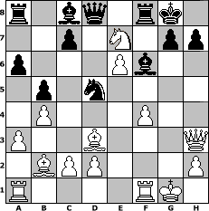 game notation in PGN-format [Event "Orang - Utan"] [Site "www.myChess.de"] [Date "2012.03.06"] [Round "1"] [White "espero"] [Black "OwainGwynedd"] [ECO "A00"] [WhitemyELO "1620"] [BlackmyELO "1417"] [Result "1-0"] [TimeControl "10/2592000"] [WhiteDays "90"] [BlackDays "63"] [MyChessNo "80368"] 1. b4 d5 2. Bb2 Bd7 3. e3 b5 4. Nf3 Nf6 5. Nc3 e6 6. Ne5 a6 7. a3 Bd6 8. f4 d4 9. exd4 O-O 10. Bd3 Nc6 11. Ne2 Be8 12. O-O Be7 13. Qe1 Nd5 14. Qg3 f6 15. Qh3 f5 16. g4 Nxe5 17. dxe5 Bc6 18. Nd4 Bd7 19. gxf5 exf5 20. e6 Bc8 21. Nxf5 Bf6 22. Ne7+ 1-0 position notation in FEN-format r1bq1rk1/2p1N1pp/p3Pb2/1p1n4/1P3P2/P2B3Q/1BPP3P/R4RK1 - - - 2 22 Captured white pieces: Captured black pieces: Click on a captured piece in order to display the desired move!