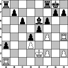 game notation in PGN-format [Event "Dann mal los"] [Site "www.myChess.de"] [Date "2006.09.24"] [Round "2"] [White "crca108"] [Black "ujack1961"] [ECO "C20"] [WhitemyELO "1351"] [BlackmyELO "1816"] [Result "0-1"] [TimeControl "10/864000"] [WhiteDays "30"] [BlackDays "30"] [MyChessNo "28915"] 1. e4 e5 2. Qh5 Nc6 3. Bc4 Qe7 4. d3 Nf6 5. Qd1 Na5 6. Na3 c6 7. b4 Qxb4+ 8. Qd2 Nxe4 9. c3 Qxc3 10. Qxc3 Nxc3 11. Nc2 Na4 12. Nf3 d5 13. Bb3 Nc5 14. Nb4 Ncxb3 15. axb3 Bxb4+ 16. Bd2 Nxb3 17. Rb1 Nxd2 18. Rxb4 Nxf3+ 19. gxf3 O-O 20. Rh4 a5 21. Rh5 f6 22. Rh4 a4 23. Ke2 a3 24. Ra1 d4 25. f4 Be6 0-1 position notation in FEN-format r4rk1/1p4pp/2p1bp2/4p3/3p1P1R/p2P4/4KP1P/R7 - - - 1 26 Captured white pieces: Captured black pieces: Click on a captured piece in order to display the desired move!