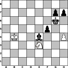 game notation in PGN-format [Event "Tigran (Wartanowitsch)Petrosjan Turnier"] [Site "www.myChess.de"] [Date "2009.08.09"] [Round "1"] [White "neve"] [Black "ujack1961"] [ECO "D51"] [WhitemyELO "1504"] [BlackmyELO "1664"] [Result "0-1"] [TimeControl "10/2592000"] [WhiteDays "147"] [BlackDays "150"] [MyChessNo "58166"] 1. d4 d5 2. c4 e6 3. Nc3 Nf6 4. Bg5 Nbd7 5. cxd5 exd5 6. Nxd5 Nxd5 7. Bxd8 Bb4+ 8. Qd2 Bxd2+ 9. Kxd2 Kxd8 10. e4 Ne7 11. Bc4 f6 12. Ne2 Nb6 13. Bb3 a5 14. a4 Ng6 15. g3 Re8 16. f3 c6 17. Nc3 Ke7 18. h4 Be6 19. d5 cxd5 20. exd5 Bf7 21. Kc2 Kf8 22. Rad1 Ne5 23. Rhf1 Nec4 24. Kd3 Nxb2+ 25. Kc2 Nxd1 26. Rxd1 Re3 27. Ne4 Rxf3 28. Nd6 Rxg3 29. Nxb7 Rc8+ 30. Kb2 Re8 31. Nxa5 Rxb3+ 32. Kxb3 Bxd5+ 33. Kb4 Bf3 34. Rd4 Re4 35. Rxe4 Bxe4 36. Kb5 Nd5 37. Nc4 Nc3+ 38. Kb4 Nxa4 39. Kxa4 f5 40. Ne3 Kf7 41. Kb4 Kg6 0-1 position notation in FEN-format 8/6pp/6k1/5p2/1K2b2P/4N3/8/8 - - - 4 42 Captured white pieces: Captured black pieces: Click on a captured piece in order to display the desired move!