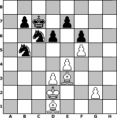 game notation in PGN-format [Event "Die magische 69 !"] [Site "www.myChess.de"] [Date "2012.02.18"] [Round "1"] [White "Erich"] [Black "larlinde"] [Variant "Fischerrandom"] [SetUp "1"] [FEN "nnbbrkqr/pppppppp/8/8/8/8/PPPPPPPP/NNBBRKQR w KQkq - 0 1"] [WhitemyELO "1993"] [BlackmyELO "2143"] [Result "1/2-1/2"] [TimeControl "10/2592000"] [WhiteDays "150"] [BlackDays "107"] [MyChessNo "80040"] 1. Nc3 d6 2. f3 c5 3. d3 Nc6 4. e4 Bb6 5. Be3 Nc7 6. Nb3 Be6 7. Qf2 f6 8. f4 O-O-O 9. Bf3 Kb8 10. O-O-O g5 11. f5 Bf7 12. Kb1 g4 13. Be2 h5 14. Na4 Bxb3 15. axb3 Ba5 16. Rdg1 Nb5 17. Bf4 Nbd4 18. Bd1 Bc7 19. h3 Qg7 20. hxg4 hxg4 21. Qg3 Rdg8 22. Qe1 Ne5 23. Rxh8 Rxh8 24. Rh1 Ndc6 25. Rh4 Ba5 26. Qh1 Rxh4 27. Qxh4 Qg8 28. Nc3 Bxc3 29. bxc3 Qd8 30. Qg3 a5 31. Bxg4 a4 32. bxa4 Qa5 33. Kb2 Nd7 34. Qe1 c4 35. Be3 Nce5 36. Be2 Nb6 37. Qa1 Nxa4+ 38. Kc1 cxd3 39. cxd3 Qxc3+ 40. Qxc3 Nxc3 41. Bh5 Kc7 42. Kc2 Nb5 43. Bd1 Nc6 44. Kd2 1/2-1/2 position notation in FEN-format 8/1pk1p3/2np1p2/1n3P2/4P3/3PB3/3K2P1/3B4 - - - 7 44 Captured white pieces: Captured black pieces: Click on a captured piece in order to display the desired move!