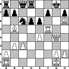game notation in PGN-format [Event "Sizilianisch: Drachen, klassisch, Reti-Tartakower"] [Site "www.myChess.de"] [Date "2008.07.06"] [Round "1"] [White "sprinterde"] [Black "Knight"] [ECO "B74"] [WhitemyELO "1637"] [BlackmyELO "1260"] [Result "1-0"] [TimeControl "10/2592000"] [WhiteDays "29"] [BlackDays "30"] [MyChessNo "46111"] 1. e4 c5 2. Nf3 d6 3. d4 cxd4 4. Nxd4 Nf6 5. Nc3 g6 6. Be3 Bg7 7. Be2 Nc6 8. O-O O-O 9. Nb3 Be6 10. f4 Qc8 11. Bb5 Ng4 12. Bd2 Bxb3 13. cxb3 Bxc3 14. bxc3 Nh6 15. f5 gxf5 16. Bxh6 Rd8 17. Rxf5 e6 18. Qg4+ 1-0 position notation in FEN-format r1qr2k1/pp3p1p/2npp2B/1B3R2/4P1Q1/1PP5/P5PP/R5K1 - - - 1 18 Captured white pieces: Captured black pieces: Click on a captured piece in order to display the desired move!