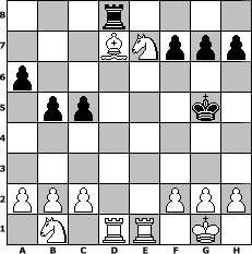 game notation in PGN-format [Event "OhneEngine ins neue Jahr"] [Site "www.myChess.de"] [Date "2009.12.16"] [Round "1"] [White "Hannes"] [Black "stierdame1965"] [ECO "A00"] [WhitemyELO "1378"] [BlackmyELO "929"] [Result "1-0"] [TimeControl "10/2592000"] [WhiteDays "30"] [BlackDays "30"] [MyChessNo "61596"] 1. Nc3 e5 2. e4 Nf6 3. Nf3 c6 4. d4 exd4 5. Qxd4 d6 6. e5 c5 7. Qe3 dxe5 8. Nxe5 Nc6 9. Bb5 Nd5 10. Nxc6+ Qe7 11. Qxe7+ Bxe7 12. Nxe7+ Kxe7 13. Nxd5+ Ke6 14. Nc7+ Kd6 15. Nxa8 Bd7 16. Bf4+ Ke6 17. Nc7+ Kf5 18. Bxd7+ Kxf4 19. O-O Rd8 20. Rad1 a6 21. Rfe1 b5 22. Nd5+ Kg5 23. Ne7 1-0 position notation in FEN-format 3r4/3BNppp/p7/1pp3k1/8/8/PPP2PPP/1N1RR1K1 - - - 3 23 Captured white pieces: Captured black pieces: Click on a captured piece in order to display the desired move!