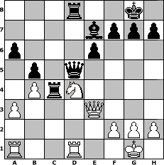 game notation in PGN-format [Event "Vor dem Urlaub noch ein schnelles Turnier!"] [Site "www.myChess.de"] [Date "2012.06.16"] [Round "1"] [White "Naunhofer"] [Black "Sanji"] [ECO "B20"] [WhitemyELO "1627"] [BlackmyELO "1547"] [Result "0-1"] [TimeControl "10/864000"] [WhiteDays "10"] [BlackDays "06"] [MyChessNo "82263"] 1. e4 c5 2. d4 cxd4 3. c3 dxc3 4. Nxc3 Nc6 5. Nf3 e6 6. Bc4 d6 7. O-O Nf6 8. Qc2 Be7 9. Rd1 O-O 10. a3 Qc7 11. Nb5 Qb8 12. b4 a6 13. Nbd4 Nxd4 14. Nxd4 b5 15. Be2 Bb7 16. Bf3 Rc8 17. Qe2 Rc4 18. e5 dxe5 19. Bxb7 Qxb7 20. Qxe5 Rd8 21. Be3 Ng4 22. Qg3 Nxe3 23. Qxe3 Qd5 0-1 position notation in FEN-format 3r2k1/4bppp/p3p3/1p1q4/1PrN4/P3Q3/5PPP/R2R2K1 - - - 1 24 Captured white pieces: Captured black pieces: Click on a captured piece in order to display the desired move!