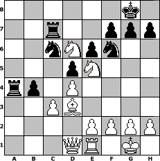 game notation in PGN-format [Event "Winter 2018"] [Site "www.myChess.de"] [Date "2018.01.10"] [Round "1"] [White "jeremyt"] [Black "Joschi"] [ECO "B13"] [WhitemyELO "2125"] [BlackmyELO "1565"] [Result "1-0"] [TimeControl "10/2592000"] [WhiteDays "15"] [BlackDays "60"] [MyChessNo "111015"] 1. e4 c6 2. d4 d5 3. exd5 cxd5 4. Bd3 Nc6 5. c3 Nf6 6. Bf4 e6 7. Nf3 Bd6 8. Bxd6 Qxd6 9. O-O O-O 10. Re1 a6 11. Nbd2 b5 12. b4 Bb7 13. Nb3 Rfc8 14. Nc5 Rc7 15. a4 bxa4 16. Rxa4 a5 17. Ne5 axb4 18. Nxb7 Rxa4 19. Nxd6 1-0 position notation in FEN-format 6k1/2r2ppp/2nNpn2/3pN3/rp1P4/2PB4/4PPPP/3QR1K1 - - - 0 19 Captured white pieces: Captured black pieces: Click on a captured piece in order to display the desired move!