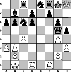game notation in PGN-format [Event "Advents Special"] [Site "www.myChess.de"] [Date "2016.11.24"] [Round "1"] [White "Hobbykegler"] [Black "paul"] [ECO "A10"] [WhitemyELO "1049"] [BlackmyELO "1299"] [Result "1-0"] [TimeControl "10/1728000"] [WhiteDays "16"] [BlackDays "20"] [MyChessNo "105822"] 1. c4 Nc6 2. b3 e6 3. Bb2 Bb4 4. a3 Bd6 5. Nc3 b6 6. Qc2 Nf6 7. Nf3 Bb7 8. e3 Qe7 9. Nb5 a6 10. Nxd6+ cxd6 11. h3 Rc8 12. g4 O-O 13. Ng5 g6 14. Bg2 e5 15. f4 exf4 16. O-O-O fxe3 17. dxe3 Qxe3+ 18. Kb1 Qxg5 19. Rhf1 Ne8 20. Qc3 h5 21. Qh8# 1-0 position notation in FEN-format 2r1nrkQ/1b1p1p2/ppnp2p1/6qp/2P3P1/PP5P/1B4B1/1K1R1R2 - - - 1 21 Captured white pieces: Captured black pieces: Click on a captured piece in order to display the desired move!