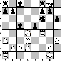 game notation in PGN-format [Event "R"] [Site "www.myChess.de"] [Date "2010.08.26"] [Round "1"] [White "Haki"] [Black "neve"] [ECO "A45"] [WhitemyELO "1312"] [BlackmyELO "1495"] [Result "0-1"] [TimeControl "10/864000"] [WhiteDays "30"] [BlackDays "24"] [MyChessNo "67883"] 1. d4 Nf6 2. Nc3 d5 3. e4 dxe4 4. f3 exf3 5. Nxf3 e6 6. Bg5 Be7 7. Bd3 Nbd7 8. Qe2 Bb4 9. O-O O-O 10. Bxf6 Nxf6 11. Ne4 Nd5 12. Neg5 h6 13. Ne5 Qxg5 14. Nf3 Qe3+ 15. Rf2 Qxe2 16. Bxe2 Nf6 17. a3 Bd6 18. Bd3 c5 19. h3 cxd4 20. Nxd4 Bc5 21. Rf4 e5 0-1 position notation in FEN-format r1b2rk1/pp3pp1/5n1p/2b1p3/3N1R2/P2B3P/1PPP2P1/R5K1 - - - 0 22 Captured white pieces: Captured black pieces: Click on a captured piece in order to display the desired move!