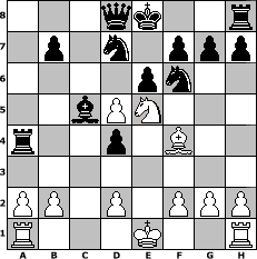 game notation in PGN-format [Event "BENONI"] [Site "www.myChess.de"] [Date "2005.06.20"] [Round "1"] [White "Gno"] [Black "NoBody"] [ECO "A56"] [WhitemyELO "1141"] [BlackmyELO "1772"] [Result "0-1"] [TimeControl "10/864000"] [WhiteDays "10"] [BlackDays "10"] [MyChessNo "14207"] 1. d4 Nf6 2. c4 c5 3. Nf3 e6 4. e4 Nxe4 5. Bd3 Nf6 6. Nc3 d5 7. Ne5 cxd4 8. Nb5 Bc5 9. Bf4 a6 10. cxd5 axb5 11. Bxb5+ Bd7 12. Bxd7+ Nbxd7 13. Qa4 Rxa4 0-1 position notation in FEN-format 3qk2r/1p1n1ppp/4pn2/2bPN3/r2p1B2/8/PP1P1PPP/R3K2R - KQk - 0 14 Captured white pieces: ![]() ![]() ![]() ![]() ![]() ![]() ![]() ![]() ![]() ![]() ![]() ![]() ![]() ![]() ![]() Captured black pieces: ![]() ![]() ![]() ![]() ![]() ![]() ![]() ![]() ![]() ![]() ![]() ![]() ![]() ![]() ![]() Click on a captured piece in order to display the desired move!
