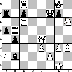 game notation in PGN-format [Event "3. Weihnachts-Open des Club Helvetia"] [Site "www.myChess.de"] [Date "2006.12.01"] [Round "1"] [White "Phantasos"] [Black "UPS"] [ECO "A06"] [WhitemyELO "2106"] [BlackmyELO "1738"] [Result "1-0"] [TimeControl "10/1728000"] [WhiteDays "20"] [BlackDays "20"] [MyChessNo "30640"] 1. Nf3 d5 2. d4 Nc6 3. c4 e6 4. Qc2 Nf6 5. Bg5 Be7 6. e3 O-O 7. Nc3 a6 8. Bd3 Nb4 9. Qe2 Nxd3+ 10. Qxd3 h6 11. Bxf6 Bxf6 12. O-O dxc4 13. Qxc4 Bd7 14. Rfd1 b5 15. Qd3 Bc6 16. Ne4 Bxe4 17. Qxe4 Qd6 18. Rac1 Rfd8 19. Rc6 Qd7 20. Rdc1 Ra7 21. h3 Rc8 22. Ne5 Qe8 23. g3 Qe7 24. Ng4 a5 25. R1c5 b4 26. Rb5 Qd8 27. d5 Bxb2 28. dxe6 Qe7 29. exf7+ Qxf7 30. Nxh6+ 1-0 position notation in FEN-format 2r3k1/r1p2qp1/2R4N/pR6/1p2Q3/4P1PP/Pb3P2/6K1 - - - 0 30 Captured white pieces: ![]() ![]() ![]() ![]() ![]() ![]() ![]() ![]() ![]() ![]() ![]() ![]() ![]() ![]() ![]() Captured black pieces: ![]() ![]() ![]() ![]() ![]() ![]() ![]() ![]() ![]() ![]() ![]() ![]() ![]() ![]() ![]() Click on a captured piece in order to display the desired move!