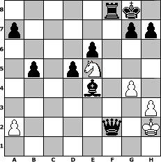 game notation in PGN-format [Event "Albspiele 15"] [Site "www.myChess.de"] [Date "2011.08.25"] [Round "1"] [White "Hobbykegler"] [Black "Caligula"] [Variant "Fischerrandom"] [SetUp "1"] [FEN "rnqknbbr/pppppppp/8/8/8/8/PPPPPPPP/RNQKNBBR w KQkq - 0 1"] [WhitemyELO "1051"] [BlackmyELO "1358"] [Result "0-1"] [TimeControl "10/1728000"] [WhiteDays "17"] [BlackDays "20"] [MyChessNo "75750"] 1. d4 f6 2. e4 d5 3. e5 Nc6 4. c3 fxe5 5. dxe5 Nxe5 6. f4 Ng6 7. Bd4 c5 8. Bf2 e6 9. Bb5 Nd6 10. Bd3 Bf7 11. Nf3 Be7 12. O-O O-O 13. h3 b5 14. Qe3 c4 15. Bc2 Nf5 16. Qe2 Bc5 17. b4 cxb3 18. Bxb3 Ng3 19. Rd1 Nxe2+ 20. Kf1 Bxf2 21. Rd2 Ngxf4 22. Kxf2 Nxc3 23. Nxc3 Qxc3 24. Re1 Nd3+ 25. Rxd3 Qxd3 26. Bd1 Rac8 27. Kg1 Rc1 28. g4 Rxd1 29. Rxd1 Qxd1+ 30. Kg2 Bg6 31. Ne5 Be4+ 32. Kg3 Qe1+ 33. Kh2 Qf2# 0-1 position notation in FEN-format 5rk1/p5pp/4p3/1p1pN3/4b1P1/7P/P4q1K/8 - - - 8 34 Captured white pieces: Captured black pieces: Click on a captured piece in order to display the desired move!