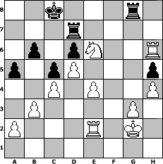 game notation in PGN-format [Event "Schnell ins neue Jahr"] [Site "www.myChess.de"] [Date "2013.01.01"] [Round "1"] [White "Caligula"] [Black "wiesel"] [ECO "C30"] [WhitemyELO "1390"] [BlackmyELO "1190"] [Result "1-0"] [TimeControl "10/864000"] [WhiteDays "10"] [BlackDays "10"] [MyChessNo "85847"] 1. e4 e5 2. f4 d6 3. Nf3 Nc6 4. Bb5 exf4 5. Nc3 Bd7 6. d3 g5 7. h3 Qf6 8. Nd5 Qd8 9. c3 Bg7 10. d4 Nf6 11. Nxf6+ Bxf6 12. O-O a6 13. Ba4 Qe7 14. Re1 O-O-O 15. d5 Ne5 16. Bxd7+ Rxd7 17. Kh1 Nc4 18. Qd3 Ne3 19. Bxe3 fxe3 20. Qxe3 b6 21. Rac1 h6 22. Nd4 Qe5 23. Nc6 Qf4 24. Qxf4 gxf4 25. Rc2 Bg5 26. c4 Re8 27. Rce2 Bh4 28. Rf1 f6 29. Rxf4 Bg5 30. Rf1 h5 31. Nd4 c5 32. Ne6 Bh4 33. Kh2 Rg8 34. Rf3 a5 35. g3 Bg5 36. h4 Bc1 37. b3 Bh6 38. Rxf6 Rh8 39. Kg2 Rg8 40. Rxh6 1-0 position notation in FEN-format 2k3r1/3r4/1p1pN2R/p1pP3p/2P1P2P/1P4P1/P3R1K1/8 - - - 0 40 Captured white pieces: Captured black pieces: Click on a captured piece in order to display the desired move!