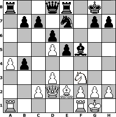 game notation in PGN-format [Event "unter uns Nr. 26"] [Site "www.myChess.de"] [Date "2015.02.14"] [Round "1"] [White "Knight"] [Black "Caligula"] [ECO "A22"] [WhitemyELO "1296"] [BlackmyELO "1353"] [Result "0-1"] [TimeControl "10/864000"] [WhiteDays "00"] [BlackDays "18"] [MyChessNo "98124"] 1. c4 e5 2. Nc3 Nf6 3. Nf3 Nc6 4. e4 Bb4 5. d3 O-O 6. Be2 d6 7. Bd2 a5 8. O-O Re8 9. Nd5 Bxd2 10. Qxd2 Nxd5 11. cxd5 Ne7 12. a4 f5 13. exf5 Bxf5 14. b4 axb4 0-1 position notation in FEN-format r2qr1k1/1pp1n1pp/3p4/3Ppb2/Pp6/3P1N2/2PQBPPP/R4RK1 - - - 0 15 Captured white pieces: ![]() ![]() ![]() ![]() ![]() ![]() ![]() ![]() ![]() ![]() ![]() ![]() ![]() ![]() ![]() Captured black pieces: ![]() ![]() ![]() ![]() ![]() ![]() ![]() ![]() ![]() ![]() ![]() ![]() ![]() ![]() ![]() Click on a captured piece in order to display the desired move!