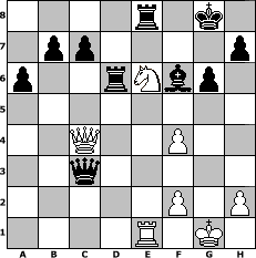 game notation in PGN-format [Event "Ja, is denn heut scho Weihnachten?"] [Site "www.myChess.de"] [Date "2014.12.06"] [Round "1"] [White "Ziegert"] [Black "freizeitspieler"] [ECO "B01"] [WhitemyELO "1226"] [BlackmyELO "1582"] [Result "0-1"] [TimeControl "10/2592000"] [WhiteDays "031"] [BlackDays "101"] [MyChessNo "97068"] 1. e4 d5 2. e5 Nc6 3. d4 f6 4. Nf3 Bg4 5. Be2 Bxf3 6. Bxf3 fxe5 7. dxe5 e6 8. O-O Nxe5 9. Bh5+ g6 10. Qe2 Qd6 11. Bf4 Bg7 12. Bf3 Ne7 13. Nc3 a6 14. Rfe1 N7c6 15. Rad1 O-O 16. Bxe5 Nxe5 17. Ne4 Nxf3+ 18. gxf3 Qb6 19. Ng5 e5 20. Rxd5 Qf6 21. Rxe5 Qc6 22. Re7 Bf6 23. Re6 Qd5 24. f4 Qxa2 25. c3 Qb3 26. Nf3 Qb5 27. Qe4 Rad8 28. Nd4 Qxb2 29. Re8 Rfxe8 30. Ne6 Rd6 31. Qc4 Qxc3 0-1 position notation in FEN-format 4r1k1/1pp4p/p2rNbp1/8/2Q2P2/2q5/5P1P/4R1K1 - - - 0 32 Captured white pieces: ![]() ![]() ![]() ![]() ![]() ![]() ![]() ![]() ![]() ![]() ![]() ![]() ![]() ![]() ![]() Captured black pieces: ![]() ![]() ![]() ![]() ![]() ![]() ![]() ![]() ![]() ![]() ![]() ![]() ![]() ![]() ![]() Click on a captured piece in order to display the desired move!