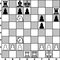game notation in PGN-format [Event "Amateur´s Mind"] [Site "www.myChess.de"] [Date "2025.03.20"] [Round "1"] [White "zoli"] [Black "Lohl"] [ECO "C67"] [WhitemyELO "2045"] [BlackmyELO "1295"] [Result "1-0"] [TimeControl "10/2592000"] [WhiteDays "25"] [BlackDays "30"] [MyChessNo "133063"] 1. e4 e5 2. Nf3 Nc6 3. Bb5 Nf6 4. O-O Nxe4 5. d4 Bd6 6. Qe2 Nf6 7. Bxc6 bxc6 8. dxe5 Bxe5 9. Qxe5+ Qe7 10. Qxe7+ Kxe7 11. Re1+ Kd8 12. Bg5 h6 13. Ne5 Rf8 14. Bxf6+ gxf6 15. Ng4 Rh8 16. Nc3 f5 17. Ne5 Rh7 18. Rad1 f6 19. Nxc6# 1-0 position notation in FEN-format r1bk4/p1pp3r/2N2p1p/5p2/8/2N5/PPP2PPP/3RR1K1 - - - 0 19 Captured white pieces: Captured black pieces: Click on a captured piece in order to display the desired move!