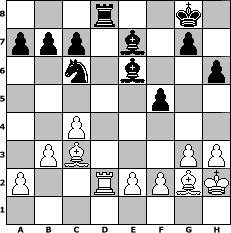 game notation in PGN-format [Event "Fernschachmeisterschaft Sfr. Heimersheim 2007"] [Site "www.myChess.de"] [Date "2007.01.21"] [Round "1"] [White "stefan"] [Black "MisterBean"] [ECO "D09"] [WhitemyELO "1756"] [BlackmyELO "1786"] [Result "0-1"] [TimeControl "10/2592000"] [WhiteDays "30"] [BlackDays "30"] [MyChessNo "31867"] 1. d4 d5 2. c4 e5 3. dxe5 d4 4. Nf3 Nc6 5. g3 Nge7 6. Bg2 Ng6 7. O-O Ngxe5 8. Nbd2 Be7 9. b3 O-O 10. Bb2 Nxf3+ 11. Nxf3 Bf6 12. Nd2 Bg4 13. Ne4 Be7 14. h3 Be6 15. Qd2 Qd7 16. Kh2 h6 17. Rfd1 f5 18. Nc3 dxc3 19. Bxc3 Qxd2 20. Rxd2 Rad8 21. Rad1 Rxd2 22. Rxd2 Rd8 0-1 position notation in FEN-format 3r2k1/ppp1b1p1/2n1b2p/5p2/2P5/1PB3PP/P2RPPBK/8 - - - 1 23 Captured white pieces: ![]() ![]() ![]() ![]() ![]() ![]() ![]() ![]() ![]() ![]() ![]() ![]() ![]() ![]() ![]() Captured black pieces: ![]() ![]() ![]() ![]() ![]() ![]() ![]() ![]() ![]() ![]() ![]() ![]() ![]() ![]() ![]() Click on a captured piece in order to display the desired move!