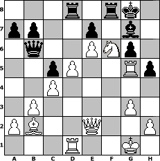 game notation in PGN-format [Event "Pfingsturnier"] [Site "www.myChess.de"] [Date "2019.05.31"] [Round "2"] [White "Helmut48"] [Black "martinus"] [ECO "A53"] [WhitemyELO "2079"] [BlackmyELO "1783"] [Result "1-0"] [TimeControl "10/2592000"] [WhiteDays "81"] [BlackDays "82"] [MyChessNo "115147"] 1. d4 Nf6 2. c4 d6 3. Nf3 g6 4. g3 Bg7 5. Bg2 O-O 6. O-O c6 7. Nc3 Bf5 8. b3 Nbd7 9. Nh4 Be6 10. e4 Qa5 11. Qd2 Nb6 12. f4 c5 13. d5 Bd7 14. Bb2 Qb4 15. Qe2 Nh5 16. e5 dxe5 17. fxe5 Rad8 18. Rad1 f5 19. Bf3 Be8 20. Bxh5 gxh5 21. Rxf5 Nd7 22. Ne4 Qb6 23. e6 Nf6 24. Rg5 Bg6 25. Nxg6 hxg6 26. Nxf6+ 1-0 position notation in FEN-format 3r1rk1/pp2p1b1/1q2PNp1/2pP2Rp/2P5/1P4P1/PB2Q2P/3R2K1 - - - 0 26 Captured white pieces: Captured black pieces: Click on a captured piece in order to display the desired move!