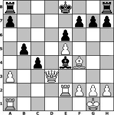 game notation in PGN-format [Event "Hobbyschach"] [Site "www.myChess.de"] [Date "2004.06.26"] [Round "1"] [White "Falcor"] [Black "TAR"] [ECO "D30"] [WhitemyELO "1322"] [BlackmyELO "1695"] [Result "1-0"] [TimeControl "10/1728000"] [WhiteDays "33"] [BlackDays "00"] [MyChessNo "5402"] 1. d4 d5 2. c4 e6 3. Nf3 Nf6 4. Nc3 Be7 5. Bf4 dxc4 6. e4 Bb4 7. Qc2 b5 8. Be2 Bb7 9. e5 Be4 10. Qd1 Nd5 11. Qd2 c5 12. O-O Nc6 13. a3 Bxc3 14. bxc3 cxd4 15. Nxd4 Nxc3 16. Qxc3 Nxd4 17. Rfe1 Nxe2+ 18. Rxe2 Qd3 19. Qxd3 1-0 position notation in FEN-format r3k2r/p4ppp/4p3/1p2P3/2p1bB2/P2Q4/4RPPP/R5K1 - kq - 0 19 Captured white pieces: Captured black pieces: Click on a captured piece in order to display the desired move!