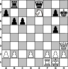 game notation in PGN-format [Event "2016"] [Site "www.myChess.de"] [Date "2016.01.01"] [Round "1"] [White "Helmut48"] [Black "hape50"] [ECO "D30"] [WhitemyELO "1965"] [BlackmyELO "1281"] [Result "1-0"] [TimeControl "10/2592000"] [WhiteDays "30"] [BlackDays "29"] [MyChessNo "101918"] 1. d4 d5 2. c4 e6 3. Nf3 h6 4. e3 b6 5. Nc3 Nf6 6. cxd5 exd5 7. Ne5 Be6 8. Bb5+ Bd7 9. Nxd7 Nbxd7 10. Bc6 Rb8 11. O-O Bd6 12. Qf3 O-O 13. Nxd5 Nh7 14. e4 Ng5 15. Bxg5 hxg5 16. e5 Bxe5 17. dxe5 Nxe5 18. Qc3 Nxc6 19. Qxc6 Re8 20. Rae1 Re6 21. Rxe6 fxe6 22. Qxe6+ Kh8 23. Qf5 c6 24. Qh3+ Kg8 25. Qe6+ Kh7 26. Ne7 Qe8 27. Qh3+ 1-0 position notation in FEN-format 1r2q3/p3N1pk/1pp5/6p1/8/7Q/PP1P1PPP/5RK1 - - - 7 27 Captured white pieces: Captured black pieces: Click on a captured piece in order to display the desired move!