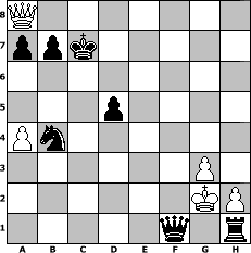 game notation in PGN-format [Event "unter uns Nr. 36 (sonnige Herbsttage)"] [Site "www.myChess.de"] [Date "2016.10.08"] [Round "1"] [White "mudb"] [Black "augustus"] [ECO "A20"] [WhitemyELO "1079"] [BlackmyELO "1211"] [Result "0-1"] [TimeControl "10/864000"] [WhiteDays "07"] [BlackDays "19"] [MyChessNo "105215"] 1. c4 e5 2. g3 Bc5 3. e3 Nf6 4. f3 O-O 5. Nc3 c6 6. Bd3 d6 7. a3 d5 8. Nge2 Bh3 9. b4 Bg2 10. bxc5 Bxh1 11. Kf2 Bxf3 12. Kxf3 e4+ 13. Bxe4 dxe4+ 14. Nxe4 Nxe4 15. Kxe4 Re8+ 16. Kf3 Qf6+ 17. Nf4 Qxa1 18. a4 Qe5 19. d4 Qe4+ 20. Ke2 Na6 21. Ba3 Qxe3+ 22. Kf1 Qxa3 23. d5 Qxc5 24. Qd3 Nb4 25. Qf5 Qxc4+ 26. Kg2 Re1 27. Kh3 Rh1 28. Qg5 cxd5 29. Nh5 Qf1+ 30. Kg4 f5+ 31. Qxf5 Qd1+ 32. Kh3 g6 33. Qe6+ Kf8 34. Qf6+ Ke8 35. Ng7+ Kd7 36. Qe6+ Kd8 37. Qe8+ Kc7 38. Qxa8 Qf1+ 39. Kg4 h5+ 40. Kg5 Qc1+ 41. Kxg6 Qc2+ 42. Kxh5 Qh7+ 43. Kg4 Qxg7+ 44. Kf3 Qf6+ 45. Kg2 Qf1# 0-1 position notation in FEN-format Q7/ppk5/8/3p4/Pn6/6P1/6KP/5q1r - - - 4 46 Captured white pieces: Captured black pieces: Click on a captured piece in order to display the desired move!